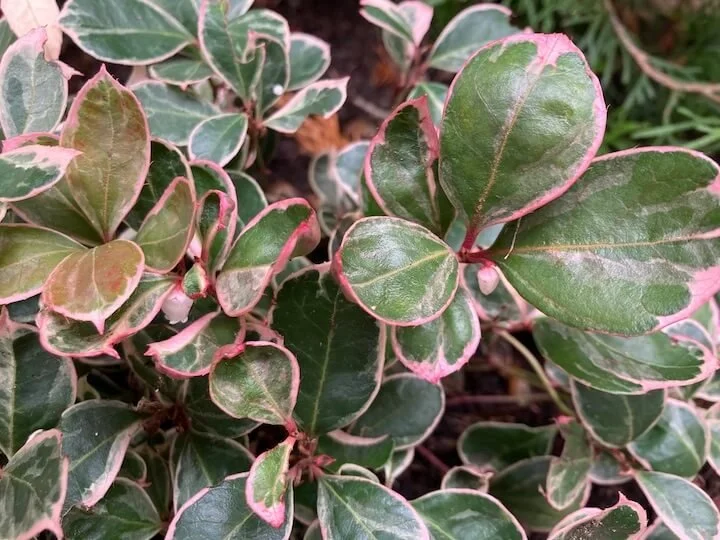 Gaultheria procumbens 'Winter Splash' is a cultivar of the native North American wintergreen plant, known for its attractive variegated foliage with glossy green leaves edged in creamy white. This evergreen ground cover has a low, spreading habit and produces small berries that start green and turn red as they mature, adding ornamental value. With its pleasant wintergreen fragrance and year-round interest, 'Winter Splash' is well-suited for shaded areas in gardens, providing a colorful and aromatic touch to winter landscapes. Thriving in acidic, well-drained soil, it is a delightful choice for woodland or rock gardens.