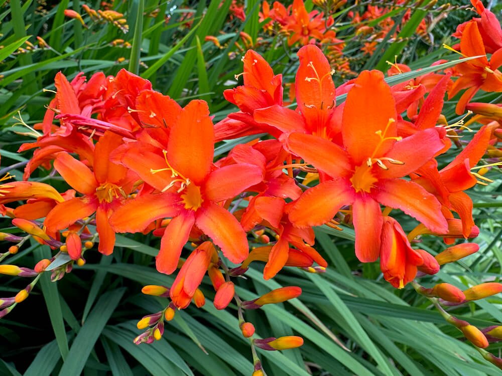 Crocosmia × crocosmiiflora 'Prometheus' is a captivating perennial renowned for its vibrant, fiery orange flowers that create a dramatic display in any garden. This hybrid is well-suited for sunny spots, where its bright blossoms can fully express their color. The long, narrow leaves offer a lush green backdrop that enhances the visual impact of the vivid flowers.