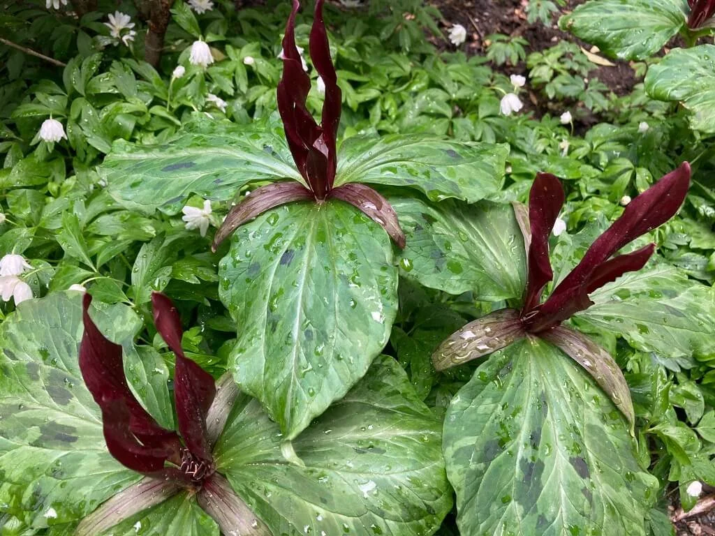 Trillium kurabayashii is a striking perennial plant native to the Pacific Northwest, prized for its elegant appearance and delicate beauty. Growing from a rhizomatous root system, it produces a single, upright stem topped with a whorl of three large, dark green, slightly glossy leaves. Its most striking feature is the deep maroon or reddish-purple flower, which emerges from the center of the leaf whorl and forms a star-like shape with three petals and three sepals. As the flower ages, it may fade to a lighter pink or white hue, adding visual interest. Thriving in moist, well-draining soil in partially to fully shaded locations, Trillium kurabayashii is ideal for woodland settings, shady gardens, or naturalized areas, where its attractive foliage and striking flowers make it a standout plant, especially when planted in groups or drifts. Additionally, it is valuable for native plant enthusiasts, providing important habitat and food sources for native wildlife.