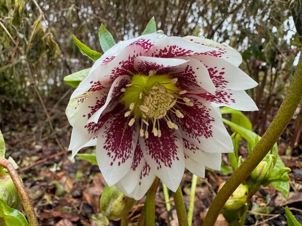 Helleborus × hybridus 'Painted Doubles' is a cultivar within the Winter Jewels series, developed by renowned breeders Ernie and Marietta O'Byrne in Oregon. This variety has fully double, white to cream-colored flowers adorned with prominent red to burgundy spotting. The blooms emerge in late winter to early spring, offering an elegant display during a time when few other plants are in flower.