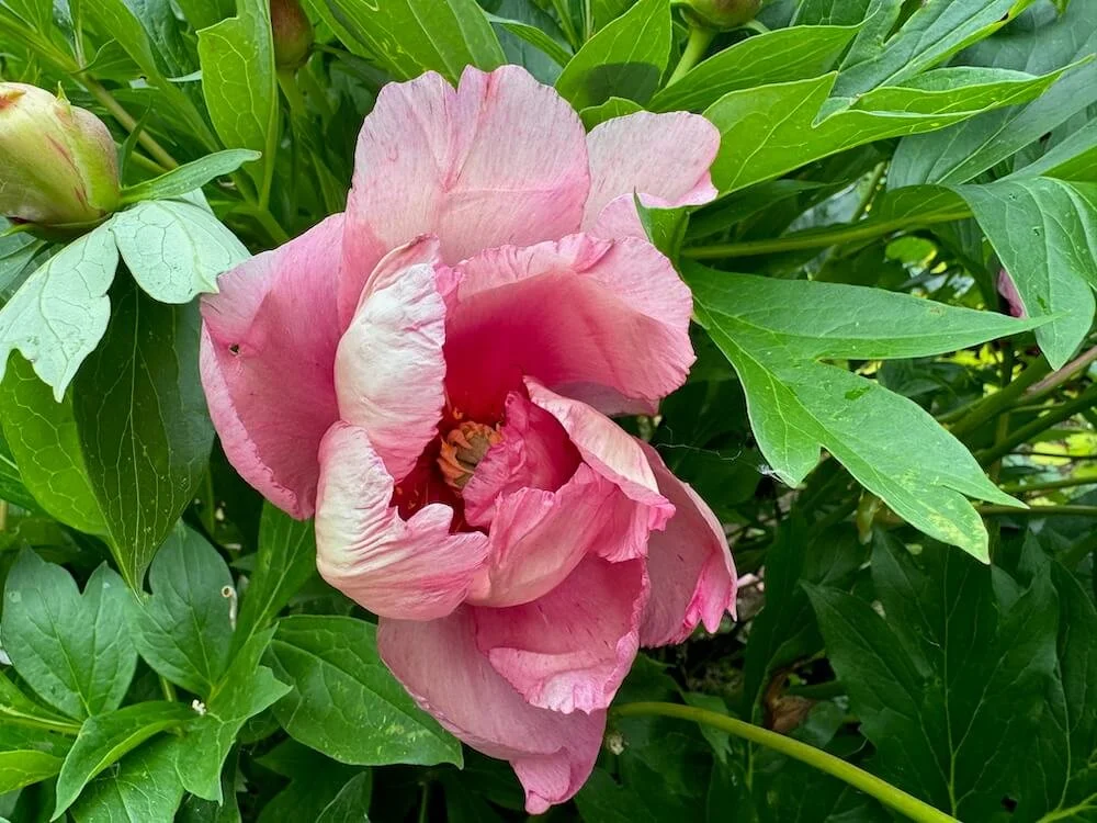 Paeonia x ‘Pink Double Dandy’ is a beautiful hybrid peony known for its lush, semi-double to double flowers and bold color contrast. The petals are a soft blend of light pink and rose, with the center of the flower displaying a darker magenta-red hue, creating a rich, dramatic focal point. These fragrant flowers emerge in late spring to early summer, standing out against the plant’s glossy green foliage.