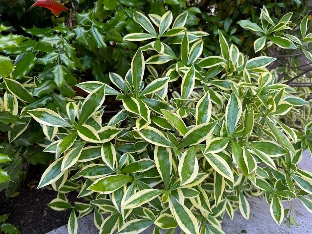 Daphne odora 'Maejima' is a compact evergreen shrub with a rounded growth habit, prized for its fragrant flowers and variegated foliage. It boasts glossy dark green leaves edged with creamy-yellow margins, adding year-round interest to the garden. In late winter to early spring, clusters of intensely fragrant, pale pink to white blooms adorn the plant, filling the air with a sweet, citrusy scent. Thriving in moist, well-drained soil and partial shade to full sun, 'Maejima' is ideal for mixed borders, woodland gardens, or as a focal point. It also makes an excellent choice for containers or as a specimen plant near patios and entryways, where its fragrance can be enjoyed. Note that the plant is toxic if ingested.