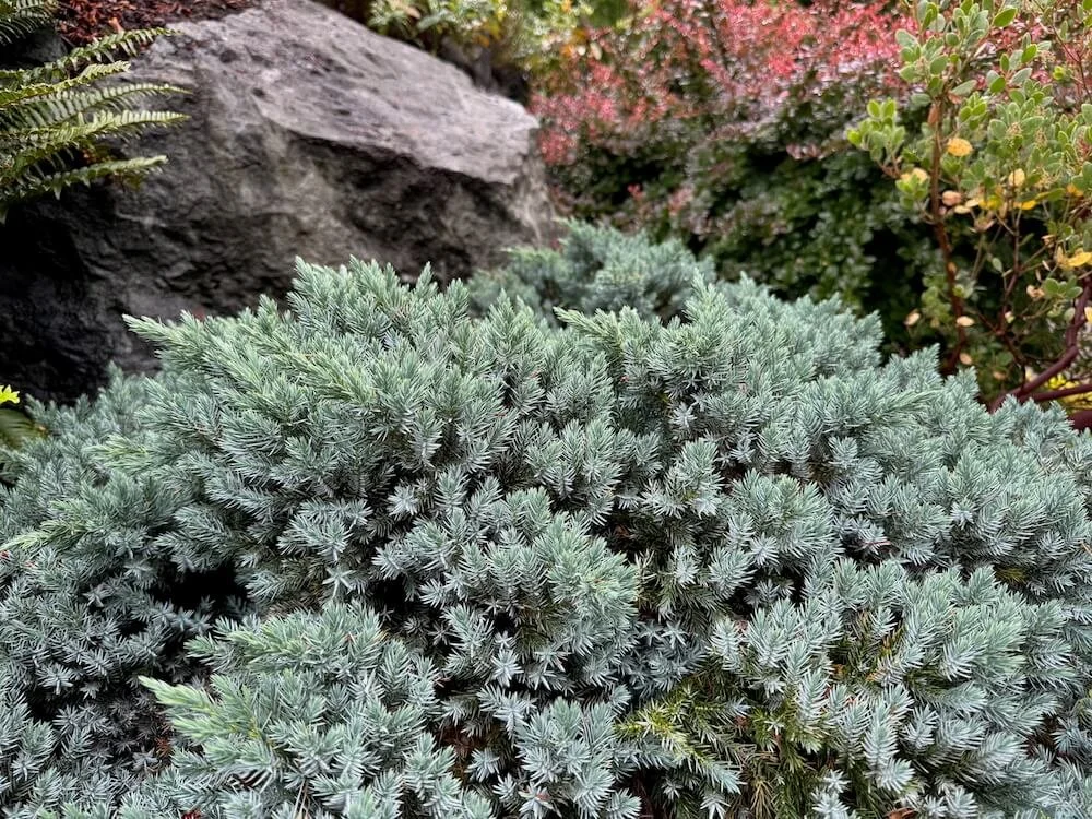 Drought-tolerant junipers provide year-round structure and texture while thriving in dry, well-drained conditions, making them reliable choices for water-wise landscapes. Juniperus squamata ‘Blue Star’ (shown here) is grown for its dense, compact form and silvery-blue needles, creating a low, mounded presence that holds its color throughout the year. Once established, it requires minimal water and performs well in exposed, sunny sites.