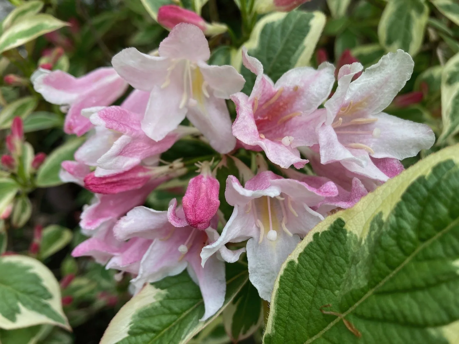 Deciduous shrub with variegated green and cream foliage and bright pink trumpet-shaped flowers in late spring and summer. Grows 4 to 6 feet tall, tolerates pruning; ideal for hedges, borders, and screens. Zones: 4 to 8.